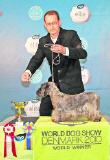 'Wanka' auf dem Siegerpodest und ein stolzes Herrchen, das Leckerli spendiert: Die Cesky-Terrier-Hündin holte sich bei der Weltrassehundeausstellung in Dänemark den Siegertitel. (Foto: Privat)